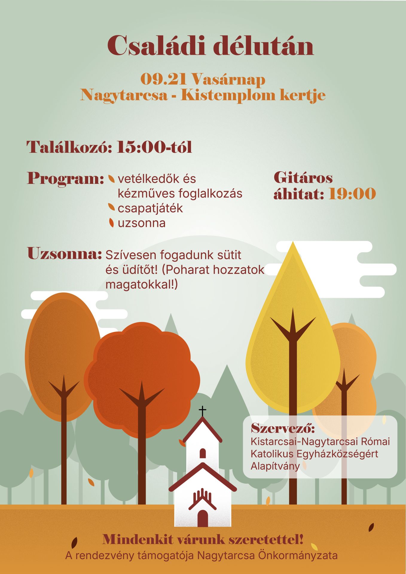 Időpont: szeptember 21. vasárnap Helyszín: Nagytarcsa – Kistemplom kertje Találkozó: 15:00-tól Program: · vetélkedők és kézműves foglalkozás – csapatjáték uzsonna Uzsonna: Szívesen …